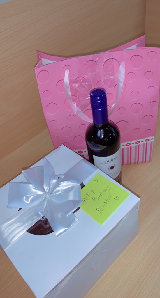 I had a small celebration at my workplace with my colleagues. They surprised me with a very beautiful and colorful cake and a bottle of wine.
